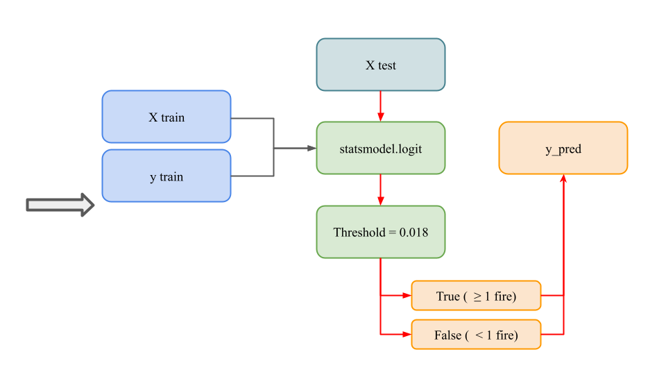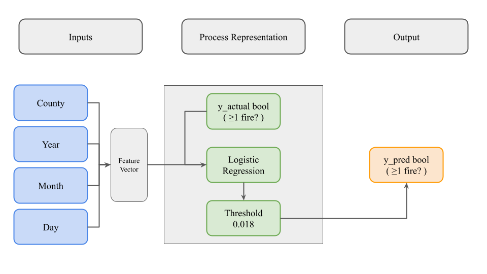 Here, our model is trying to predict a binary output (True/False) whether or not at least one fire will occur on a given county and date. Our model takes two inputs. The first is an integer that represents a county. The second is a date that is split into 3 distinct features (year, month, day). These four features are combined into a feature vector. We have a list of y values that are either True or False. Our y values represent whether a county on a given date actually had one or more fires that day. We used logistic regression with the Python module statsmodel, to get a decimal value. We evaluated this decimal value to be above or below a threshold we set while we were tuning hyperparameters, which is 0.018. Above means True, below means False. We then compared those predicted y values to the actual y values to evaluate our accuracy.